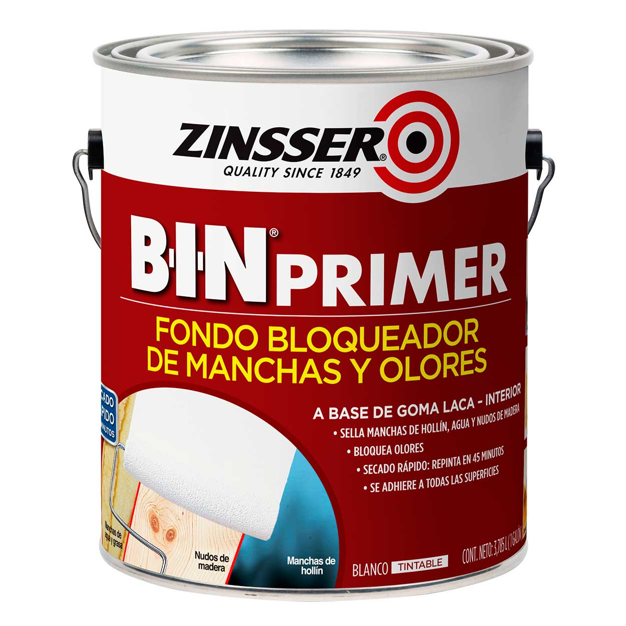 Rust-Oleum® Zinsser® B-I-N® Primer es un fondo bloqueador de manchas y olores. Es ideal para manchas de hollín y daños de fuego; sella nudos de madera y oculta manchas de humedad y grasa. Su fórmula a base de goma laca combina un tiempo de secado ultra rápido, una excelente adherencia y un extraordinario poder bloqueador. Puede aplicarse sobre cualquier tipo de superficie de interior. También puede ser utilizado para bloquear manchas puntuales en superficies de exterior.
